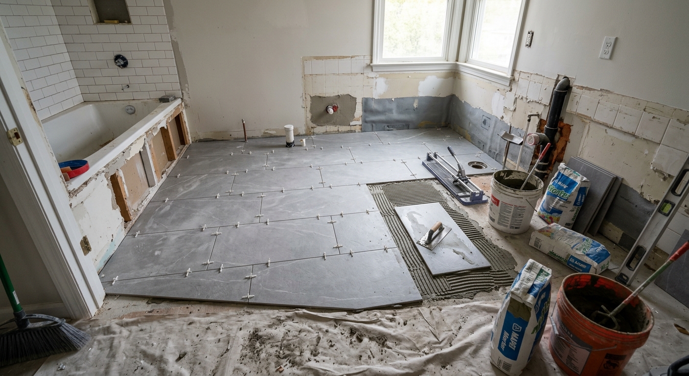 Floor and wall tile installation with professional membrane waterproofing. Essential for lasting results.