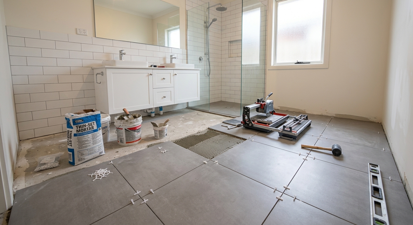 Floor and wall tile installation with professional membrane waterproofing. Essential for lasting results.