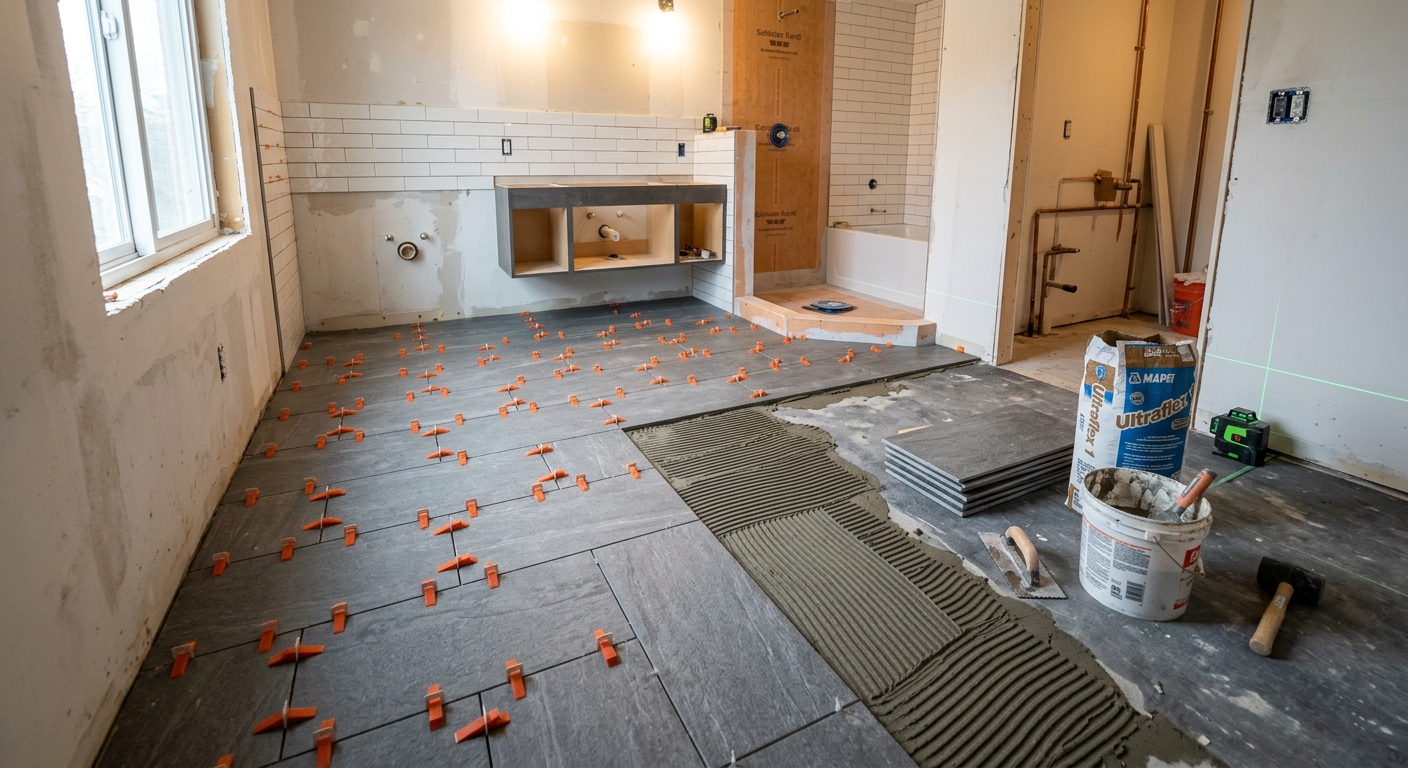 Floor and wall tile installation with professional membrane waterproofing. Essential for lasting results.